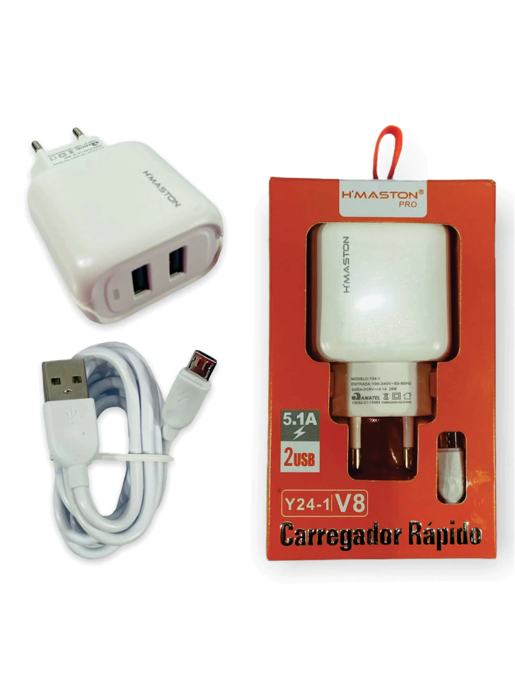 Carregador com fonte e cabo de alta qualidade, possui fonte com capacidade de 5.1A e duas saidas USB e Cabo USB de 1 Metro.